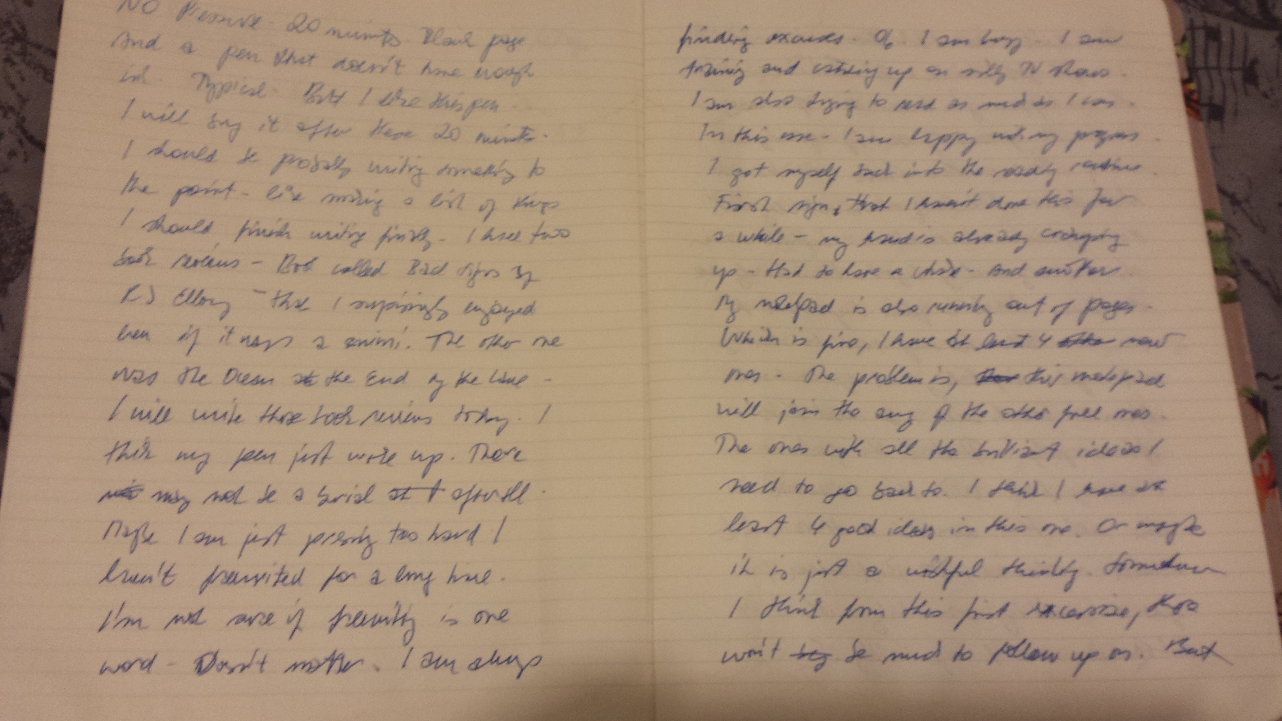I have realised I haven’t done this exercise in a while. Then I was reminded again when my fingers started cramping up after barely two pages. I filled five pages with immediate thoughts and random stuff. It was liberating but there isn’t much of a substance in it. That doesn’t mean it was pointless. The freedom that comes with ignoring the nudging self-contiousness, dismissing the urge to edit every single syllable and leaving the misspelled words at peace is what is unlocking the treasures inside us. No boundaries, no obstacles, just us.